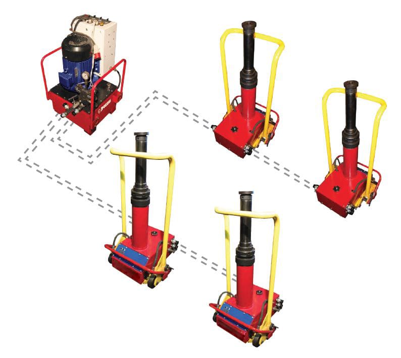 Гидростанции для гидравлических домкратов используются для привода устройств подъема и перемещения грузов. Станции обеспечивают подачу жидкости от 1,6 до 25 л/мин, с высоким давлением – до 700 бар. При работе подъемных механизмов определяющим является усилие на штоке, которое прямопропорционально максимальному давлению и площади поршня. Высокое давление позволяет снизить металлоемкость и массу домкрата. Объем бака определяется количеством масла, необходимого для заполнения всех домкратов в гидросистеме при выдвижении штока на полный ход, и обычно не превышает 250 литров.
