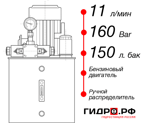 Гидравлическая станция НБР-11И1615Т с производительностью 11 л/минуту и давлением 160 атм. В конструкции используется масляный бак на 150 л и бензиновый мотор. Распределитель ручной. Цена с доставкой до адреса в Уфе 160896 руб. Популярные дополнительные опции: счетчик циклов, одновременное управление несколькими инструментами, температурный контроль, фильтр напорный, система подогрева масла.