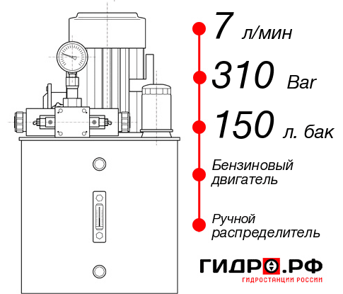 Маслостанция гидравлическая НБР-7И3115Т с потоком 7 л/минуту и давлением 310 бар. Установлен бензиновый двигатель и гидробак на 150 л. Гидрораспределитель ручной. Срок изготовления до 2 дн. Цена по прайсу с доставкой до Вашего производства в Уфе 223971 руб. Рекомендуемые варианты дооснащения: электрический датчик давления 4-2ма, теплообменник, двухсторонний гидрозамок, дополнительный ручной насос, дополнительный дренажный слив.