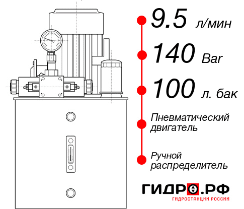 Маслостанция НПР-9,5И1410Т с давлением 140 бар и подачей 9.5 литров в минуту. Установлен гидробак на 100 литров и пневматический мотор. Гидрораспределитель ручной. Прайсовая цена с доставкой до производства в Уфе 132447 руб. Рекомендуемые варианты дооснащения: счетчик моточасов, гидравлический замок с гидроуправлением.