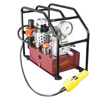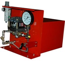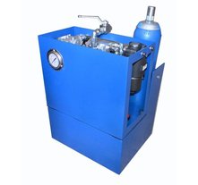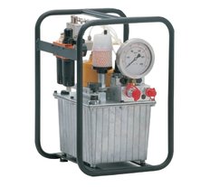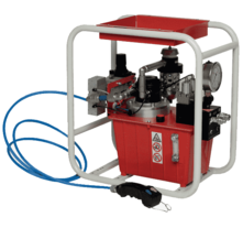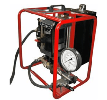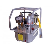 Гидростанция с пневмоприводом служит для обеспечения работы гидропривода цехового оборудования при наличии централизованной пневмомагистрали. Применяются пневматические двигатели мощностью до 7кВт. Пневмопривод обеспечивает высокую надежность работы, имеет меньшую массу по сравнению с электроприводом, но главное достоинство это безопасность при работе во взрывоопасной среде нефте-химических предприятий, газовых месторождений и шахт опасных по газу и пыли. Регулирование подачи насоса гидростанции достаточно легко реализуется изменением подачи сжатого воздуха в пневмомотор. Характеристики потока: до 55л/мин, до 700бар.