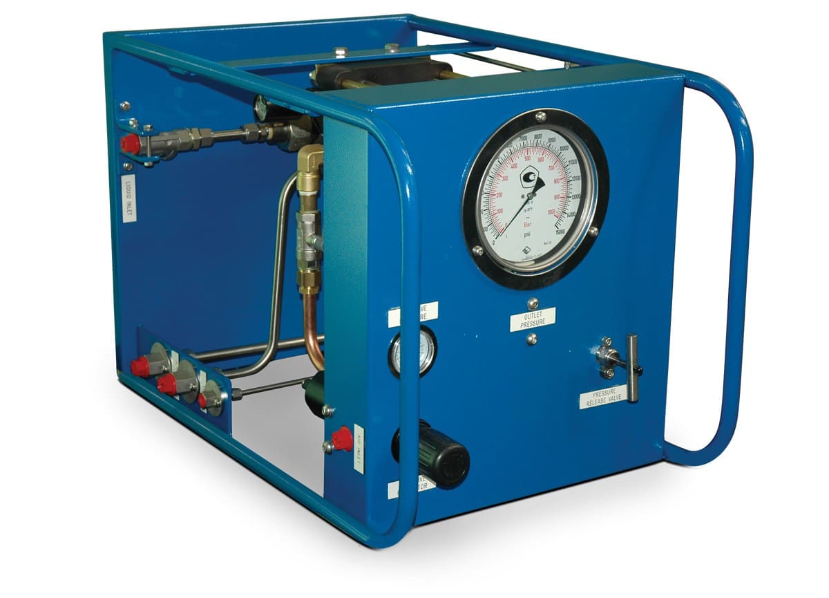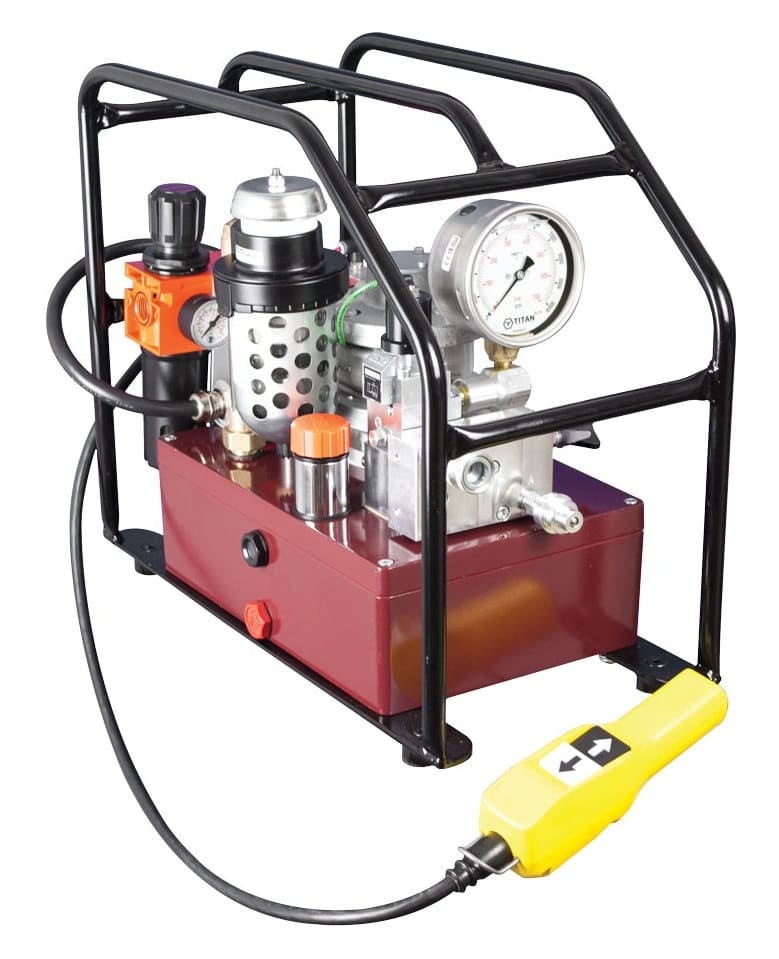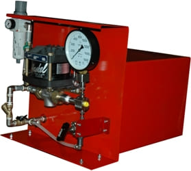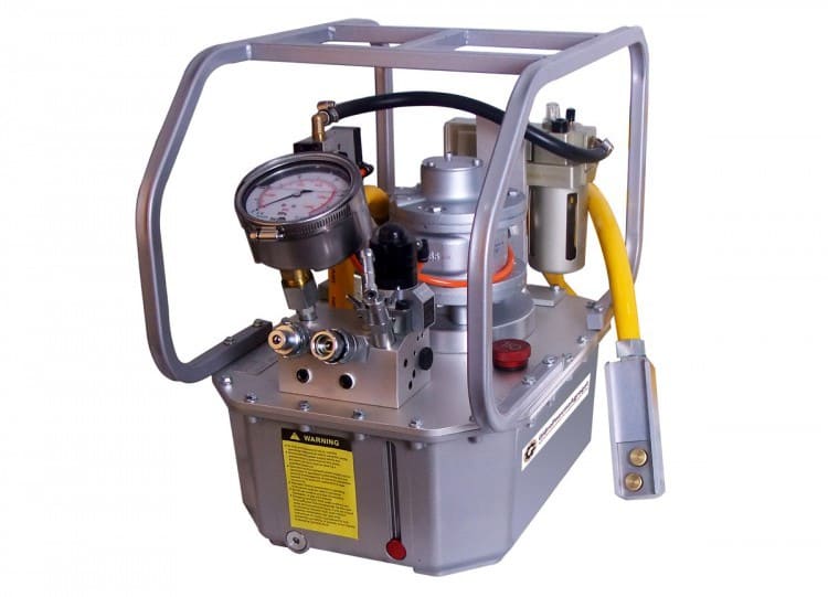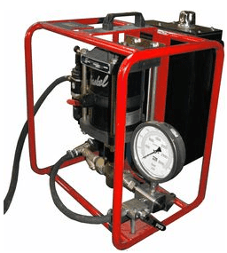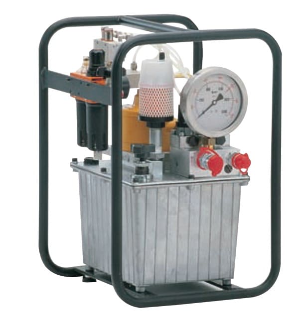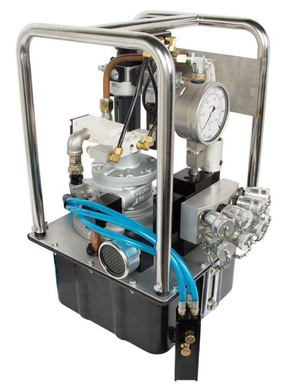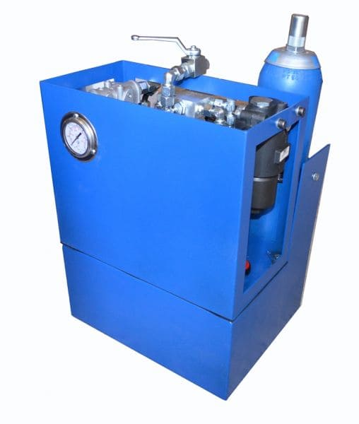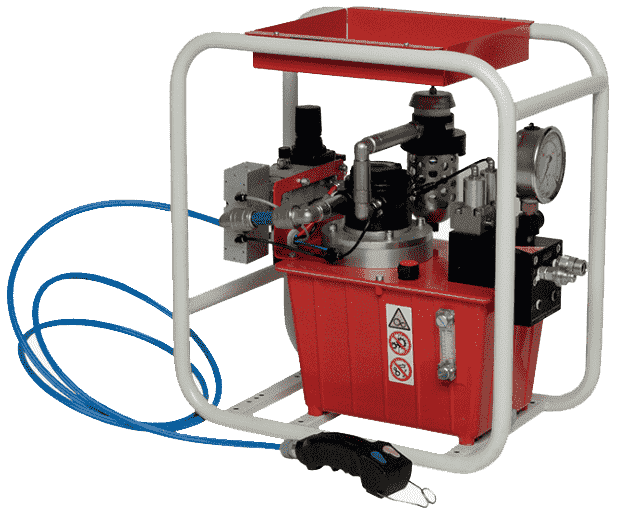 Гидростанция с пневмоприводом служит для обеспечения работы гидропривода цехового оборудования при наличии централизованной пневмомагистрали. Применяются пневматические двигатели мощностью до 7кВт. Пневмопривод обеспечивает высокую надежность работы, имеет меньшую массу по сравнению с электроприводом, но главное достоинство это безопасность при работе во взрывоопасной среде нефте-химических предприятий, газовых месторождений и шахт опасных по газу и пыли. Регулирование подачи насоса гидростанции достаточно легко реализуется изменением подачи сжатого воздуха в пневмомотор. Характеристики потока: до 55л/мин, до 700бар.