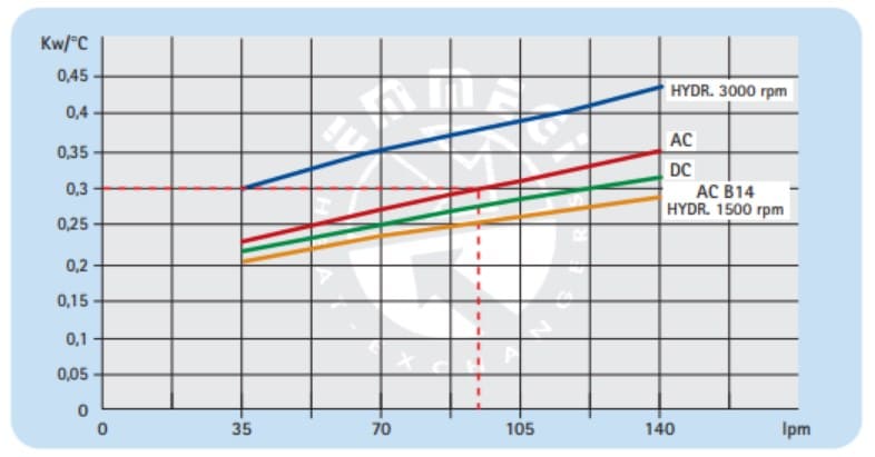 Удельный теплообмен можно рассчитать путем деления рассеиваемой мощности на разницу между температурой поступающего и температурой вытекаемого масла. Далее выбор подходящего устройства осуществляется на основе таблицы, которую предлагают производители маслоохладителей. Например.